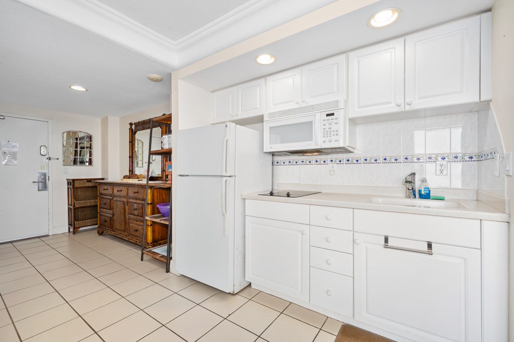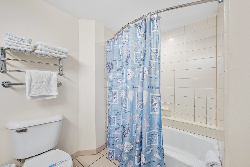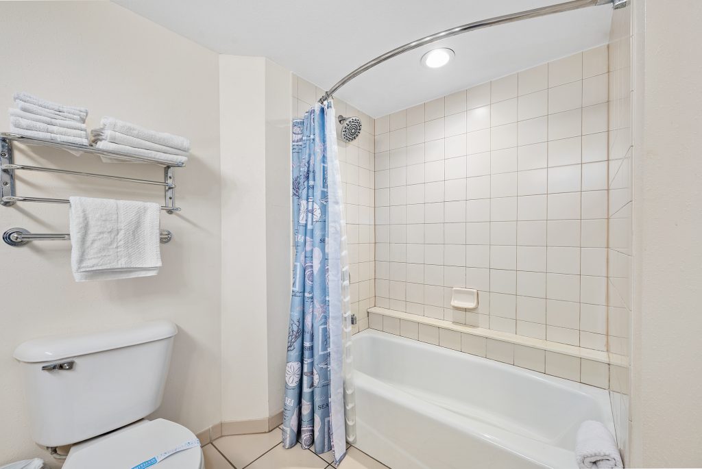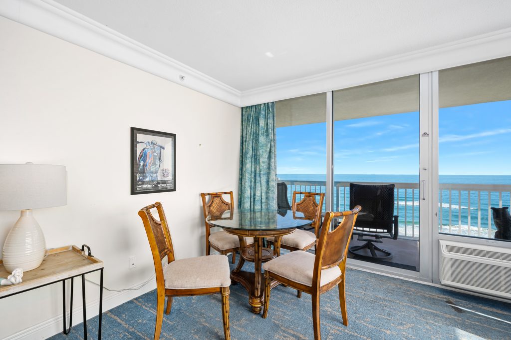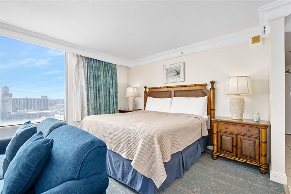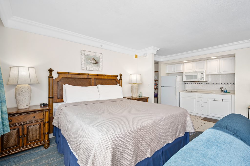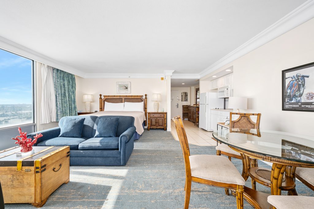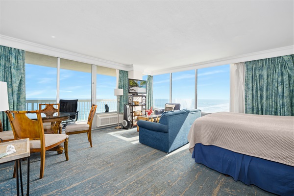Enjoy a king bed with soft linens, a cozy living area, and an efficiency kitchen ideal for simple meals. Large ocean-view windows brighten the space, while the oversized bathroom with walk-in shower adds comfort and ease. Step outside and soak in sweeping views of Daytona’s shoreline—this balcony is the star of the show.