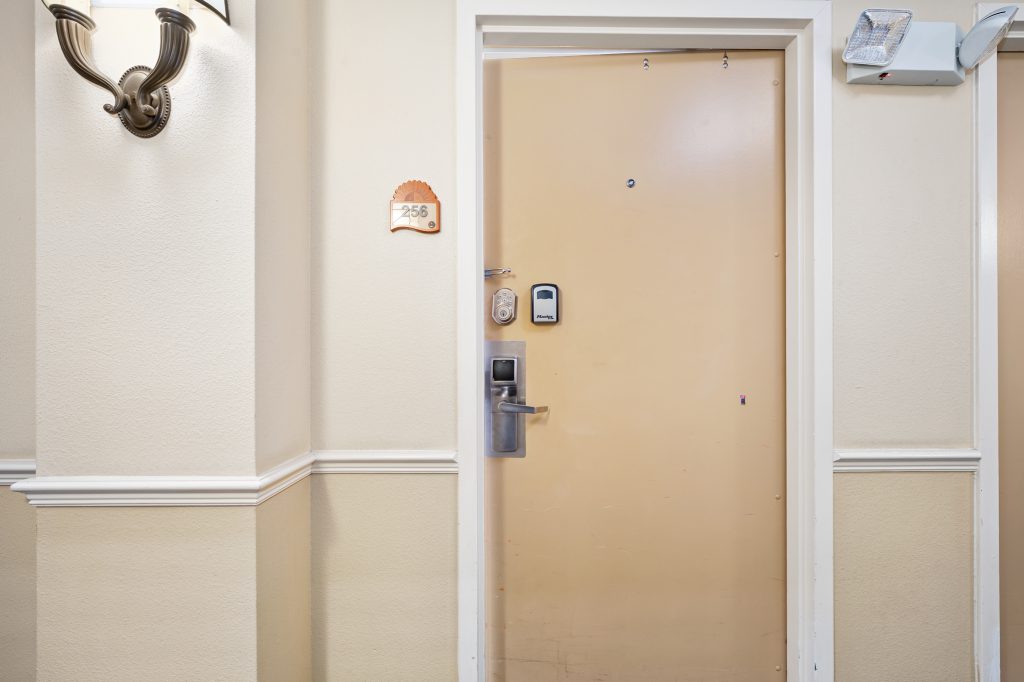 To Unit 256: Thru the lobby and turn left at the 1st set of elevators Go to the 14th story elevators Go to 2nd floor Make a left out of the elevator and walk down hallway.
