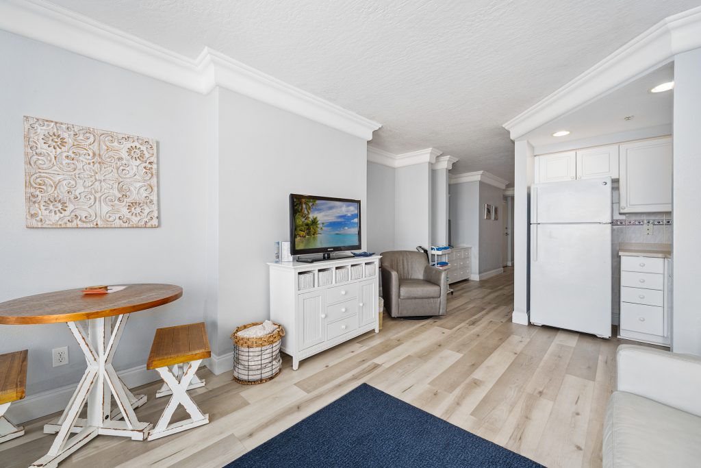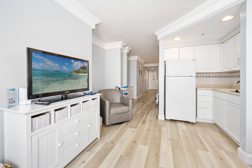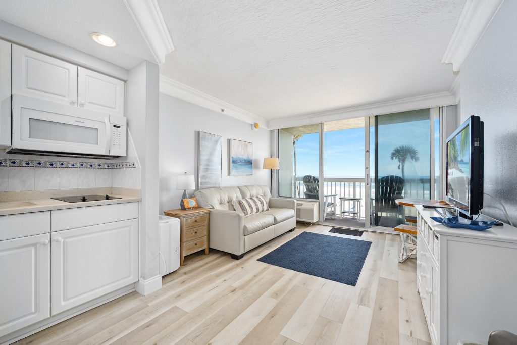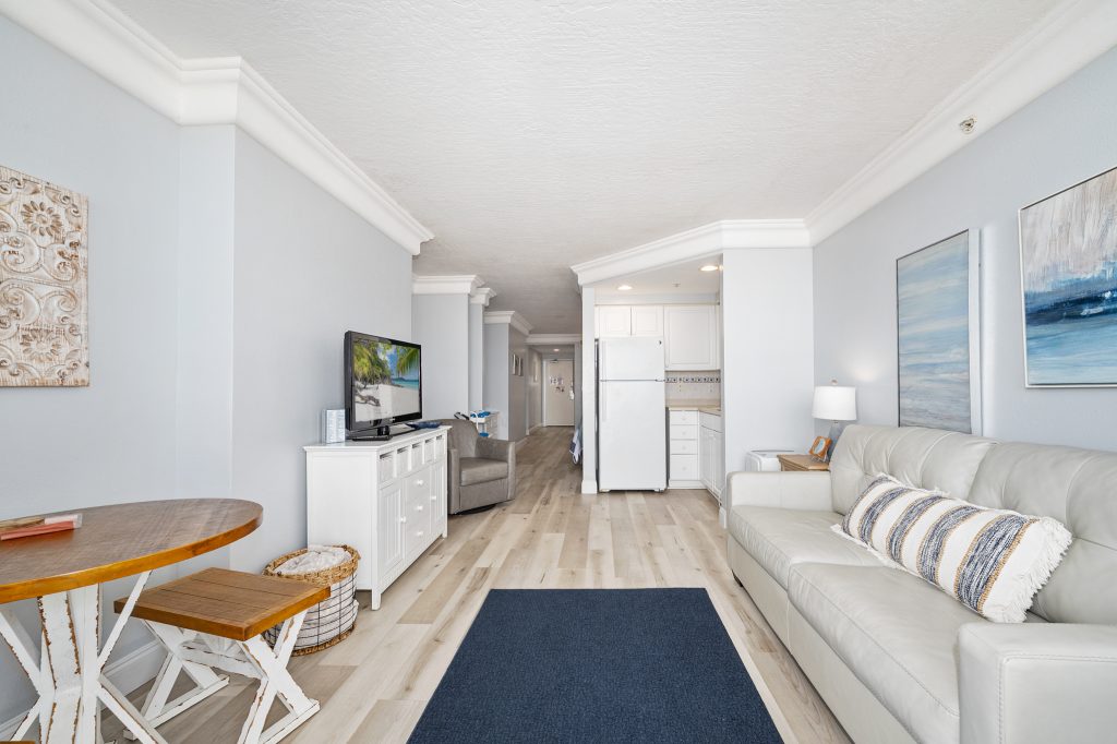 Living Area Coastal décor with sofa + chair Flat-screen TV Natural light flowing in from balcony