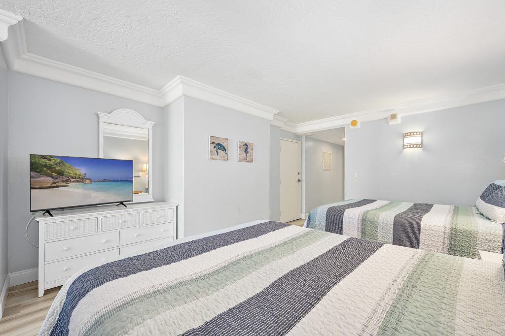 Private bedroom with two queen beds Coastal furnishings + calming tones Flat-screen TV + storage space